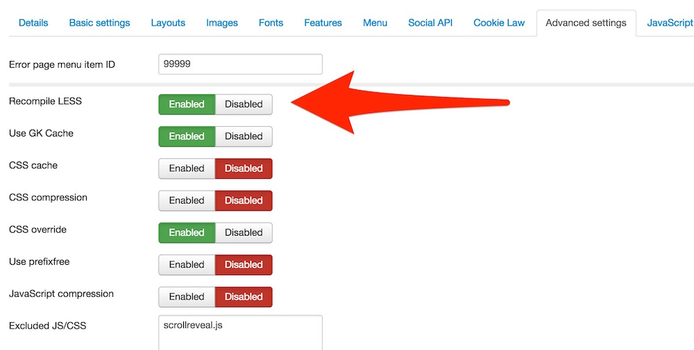 Please remember that the LESS parser should be enabled only while you are editing your LESS files - it needs relatively big amount of server resources and will cause slower page loading time. That's why please remember to disable the LESS compiler after finishing the *.less files modifications.